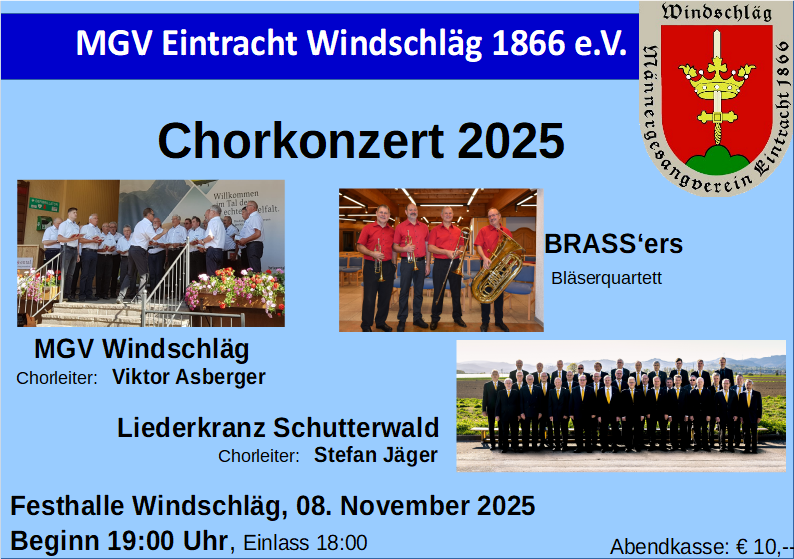 Der Männergesangverein Eintracht Windschläg unter der Leitung von Viktor Asberger lädt zu seinem Chorkonzert am 08. November 2025 in der Festhalle Windschläg ein. Nach zwei langen Jahren können wir wieder in der Festhalle Windschläg auftreten, passend dazu feiern wir 30 Jahre Dirigent Viktor Asberger beim MGV Windschläg. Dirigent und Sänger haben gemeinsam das Programm aus unserem Repertoire zusammengestellt.